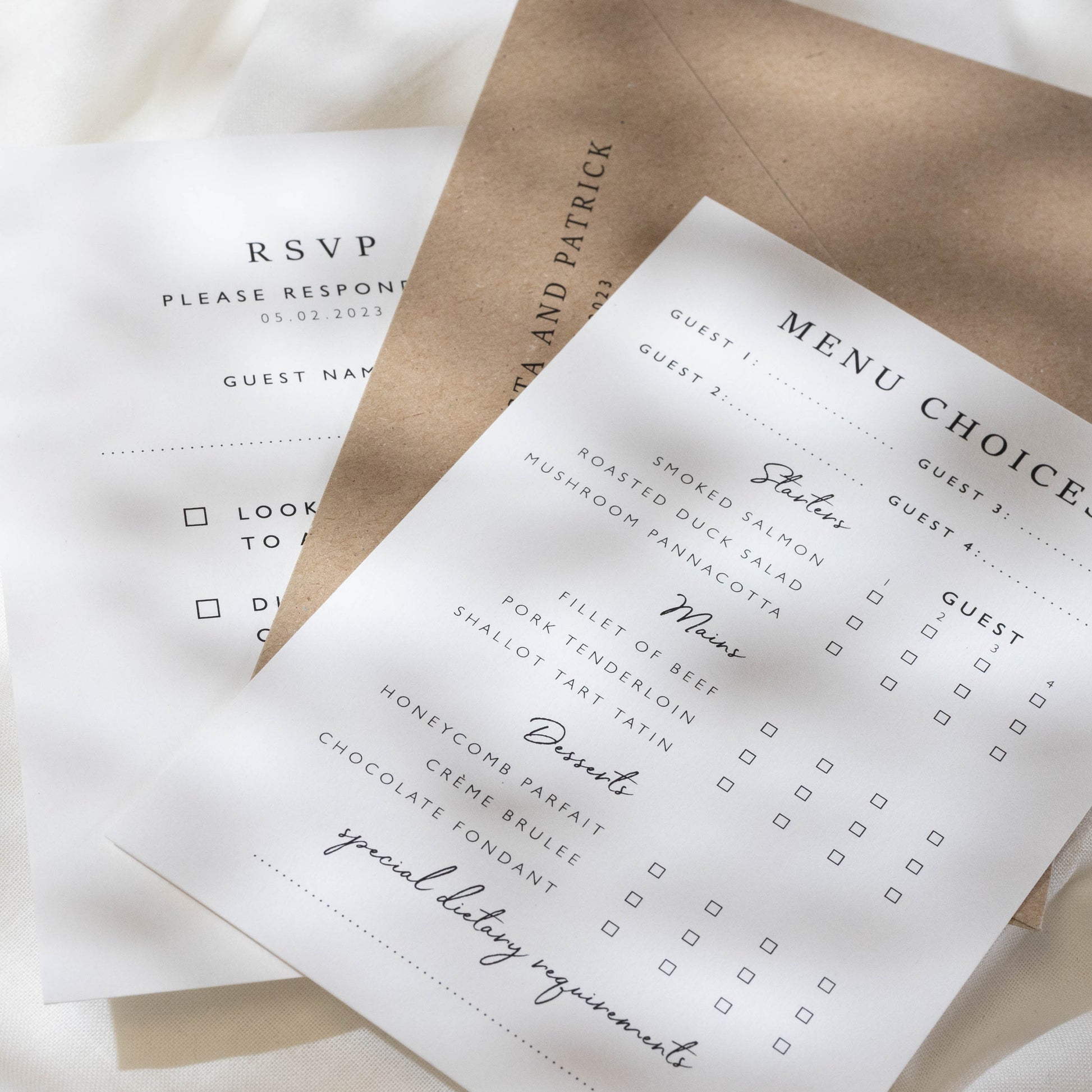 RSVPS: Choose one sided for a simple yes/no response or both sides for menu choices.