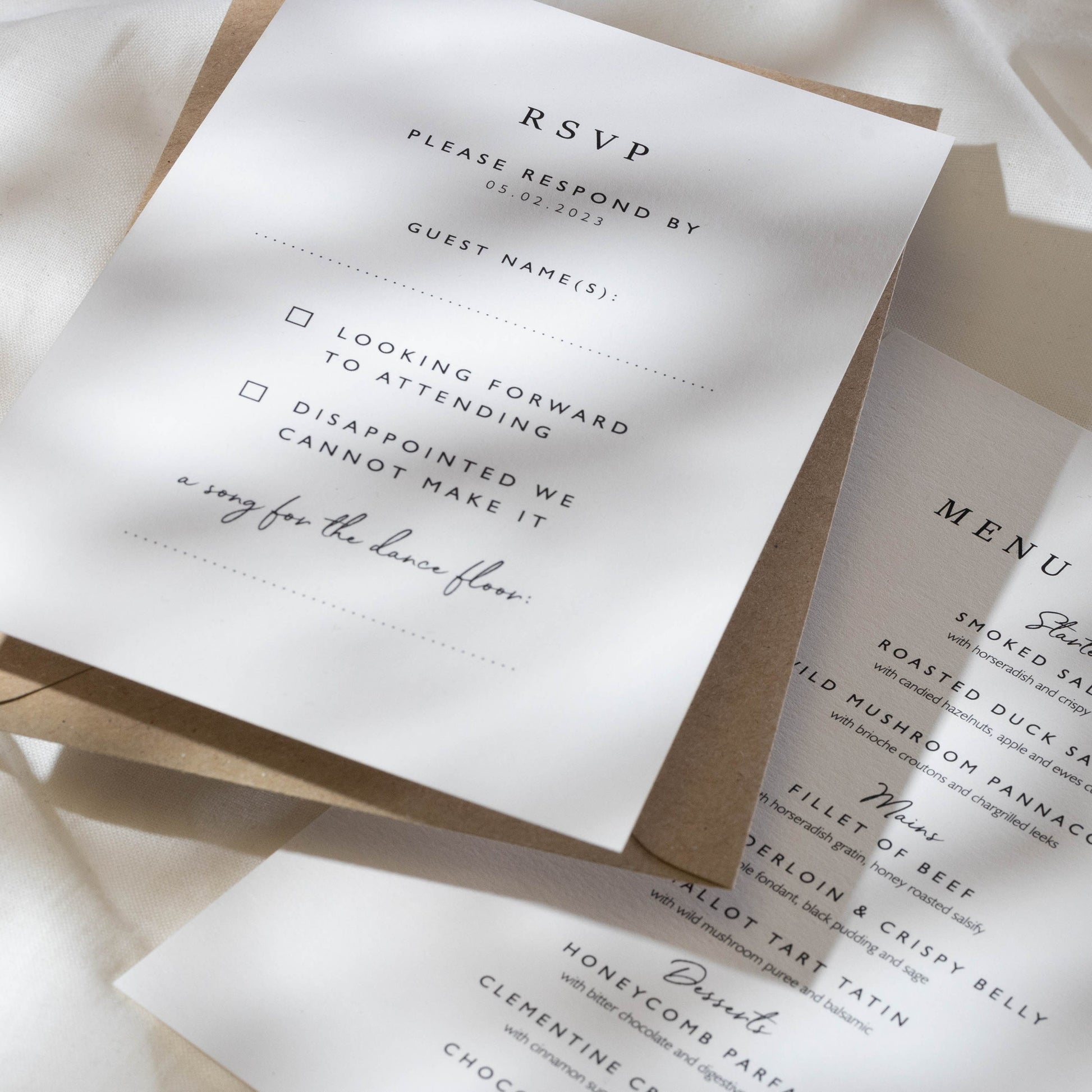 RSVPS: Choose one sided for a simple yes/no response or both sides for menu choices.