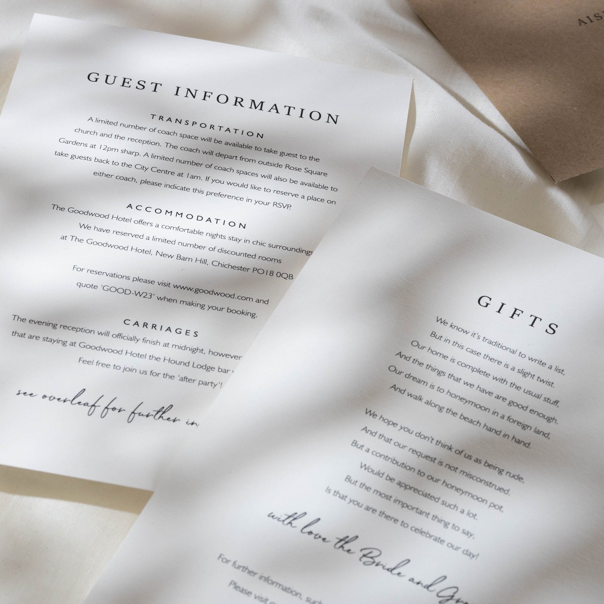 INFO CARDS: Useful for additional info such as taxi numbers, hotels, gift lists, poem's and more.