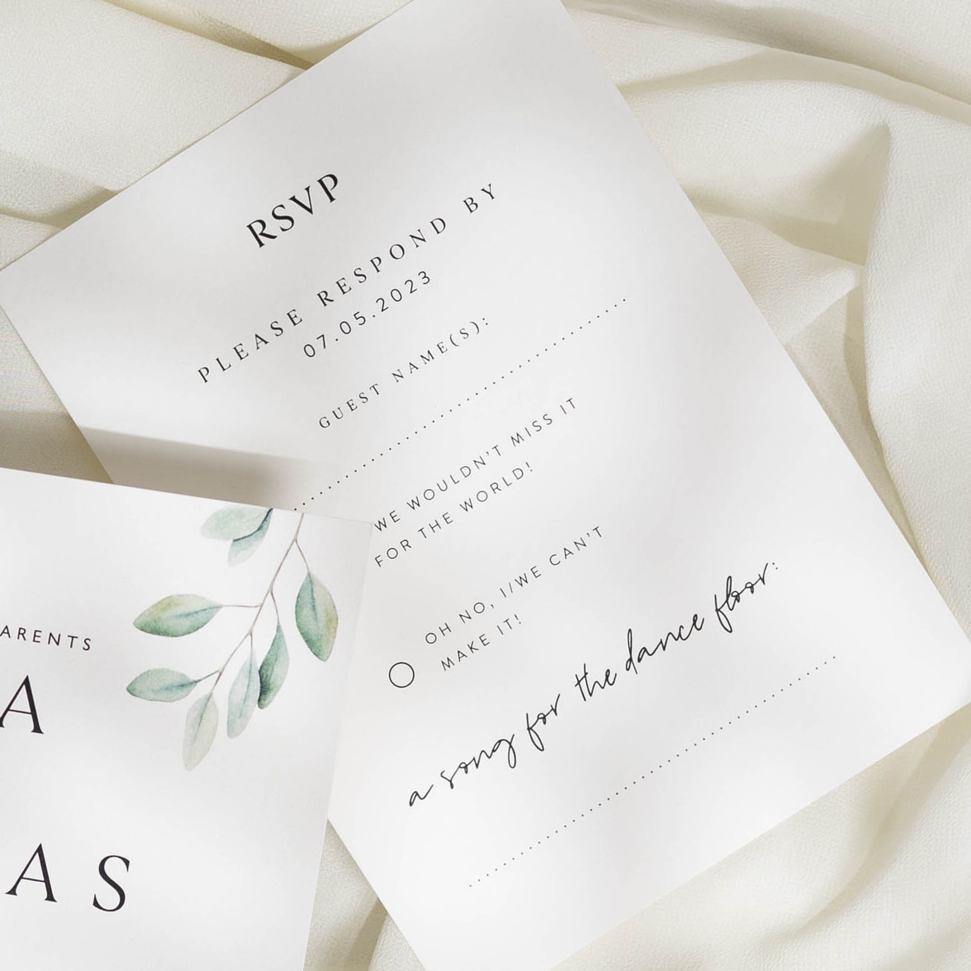 RSVPS: Choose one sided for a simple yes/no response or both sides for menu choices.