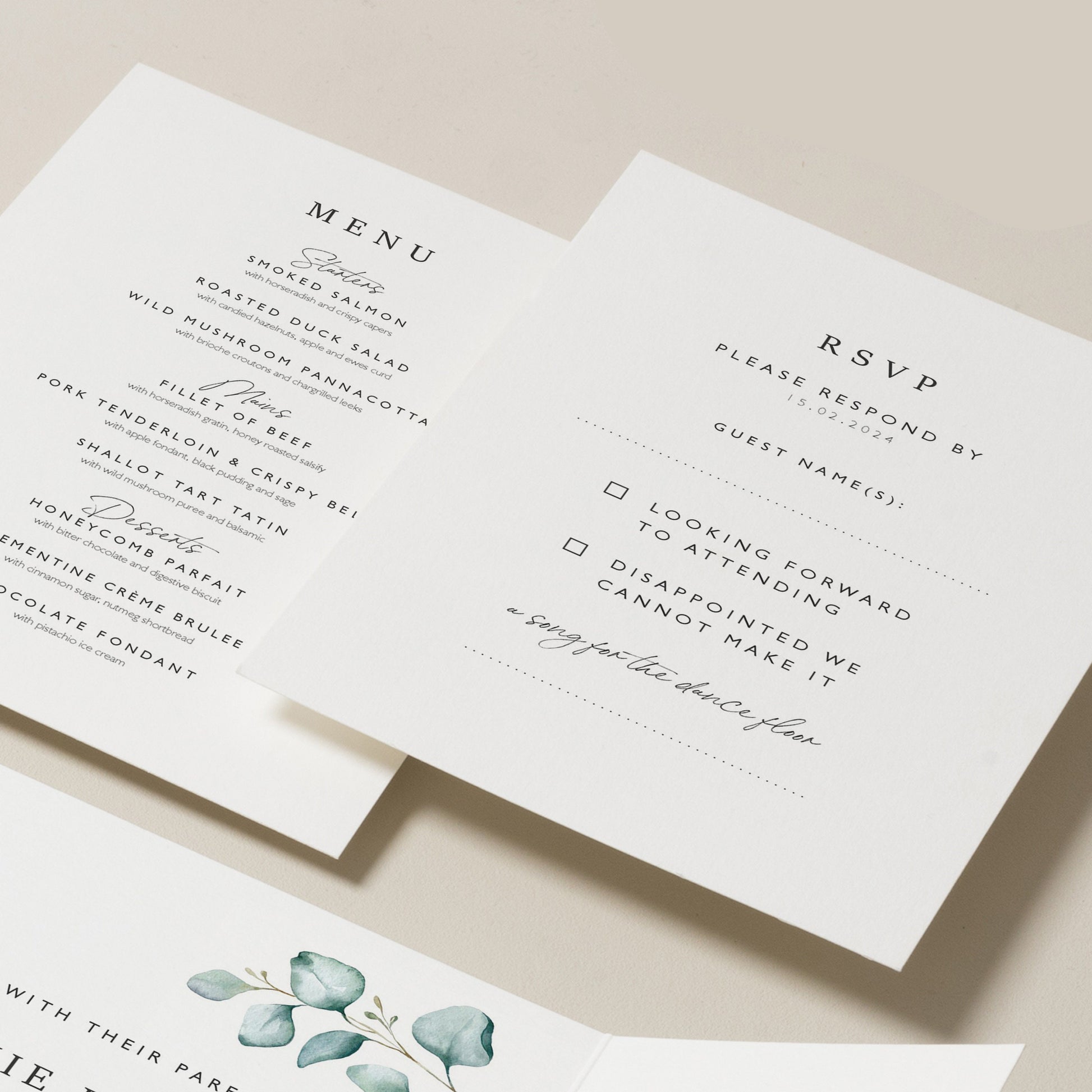 RSVPS: Choose one sided for a simple yes/no response or both sides for menu choices.
