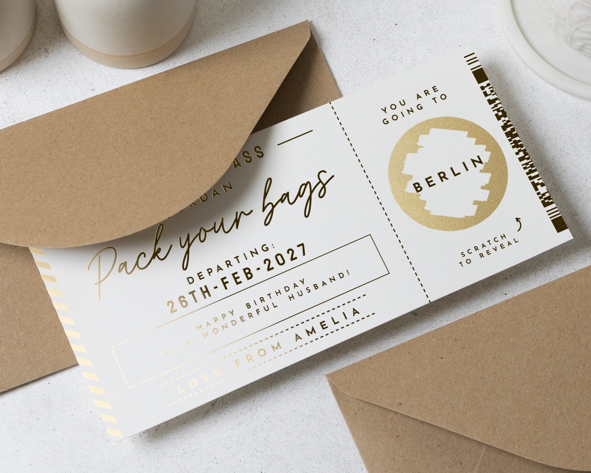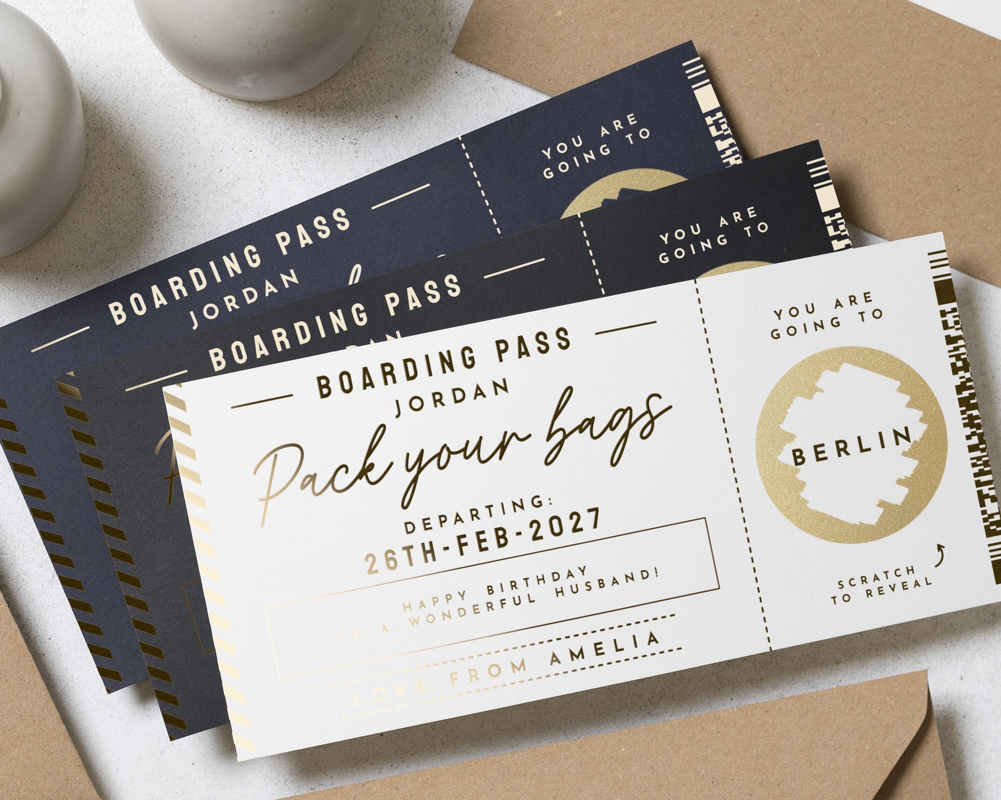 Surprise someone special with this luxurious gold foil holiday reveal boarding pass! Personalised with your details, this scratch to reveal ticket is perfect for birthdays, anniversaries, or any special occasion. A memorable way to announce a getaway.