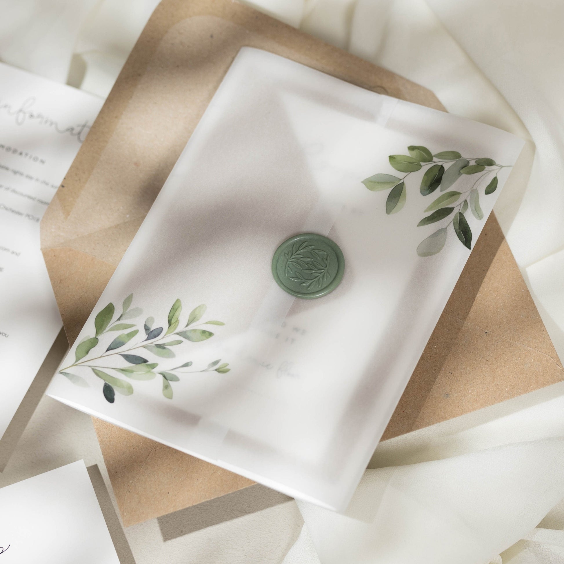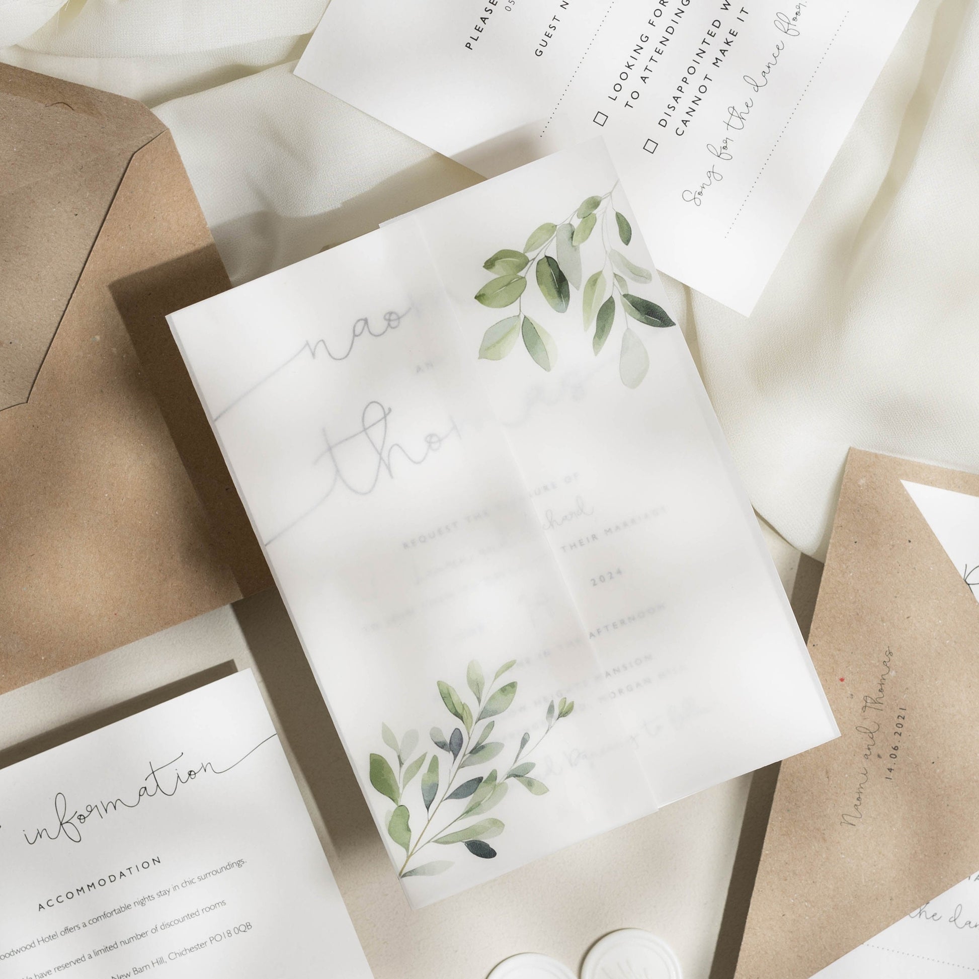 VELLUM JACKETS: Our translucent vellum jackets wrap around your invitations to add interest, texture and intrigue.