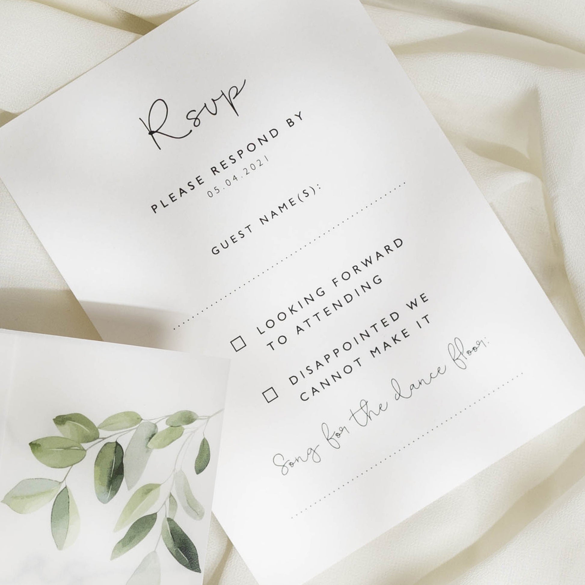 RSVPS: Choose one sided for a simple yes/no response or both sides for menu choices.