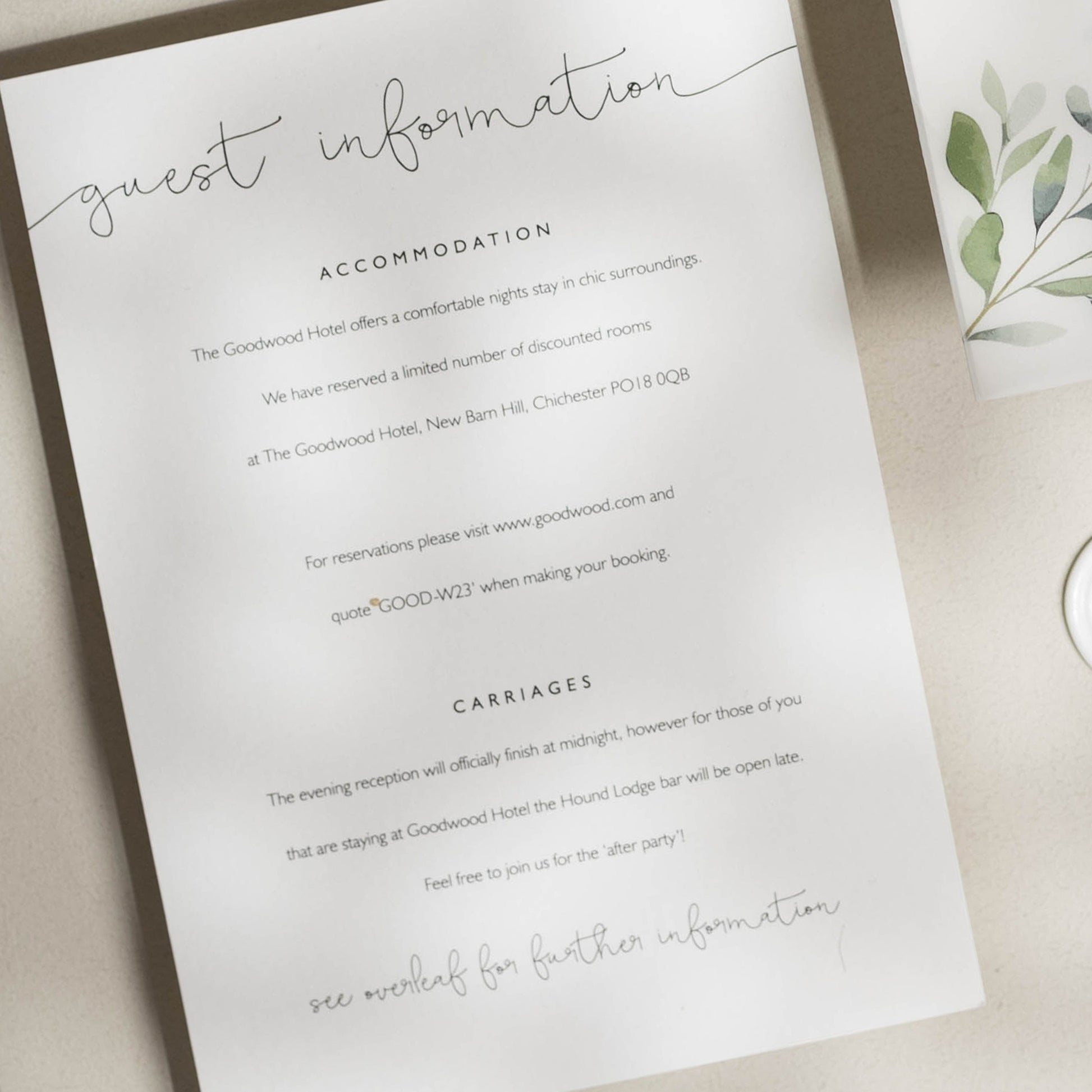 INFO CARDS: Useful for additional info such as taxi numbers, hotels, gift lists, poem's and more.