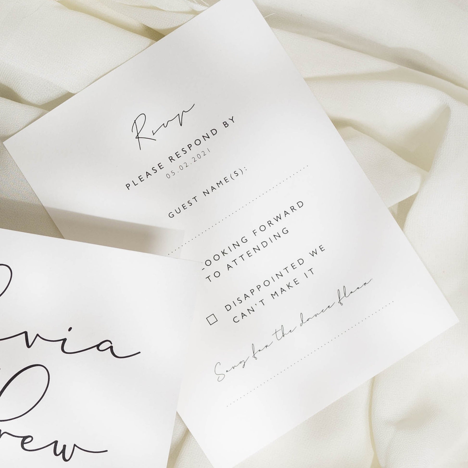 RSVPS: Choose one sided for a simple yes/no response or both sides for menu choices.