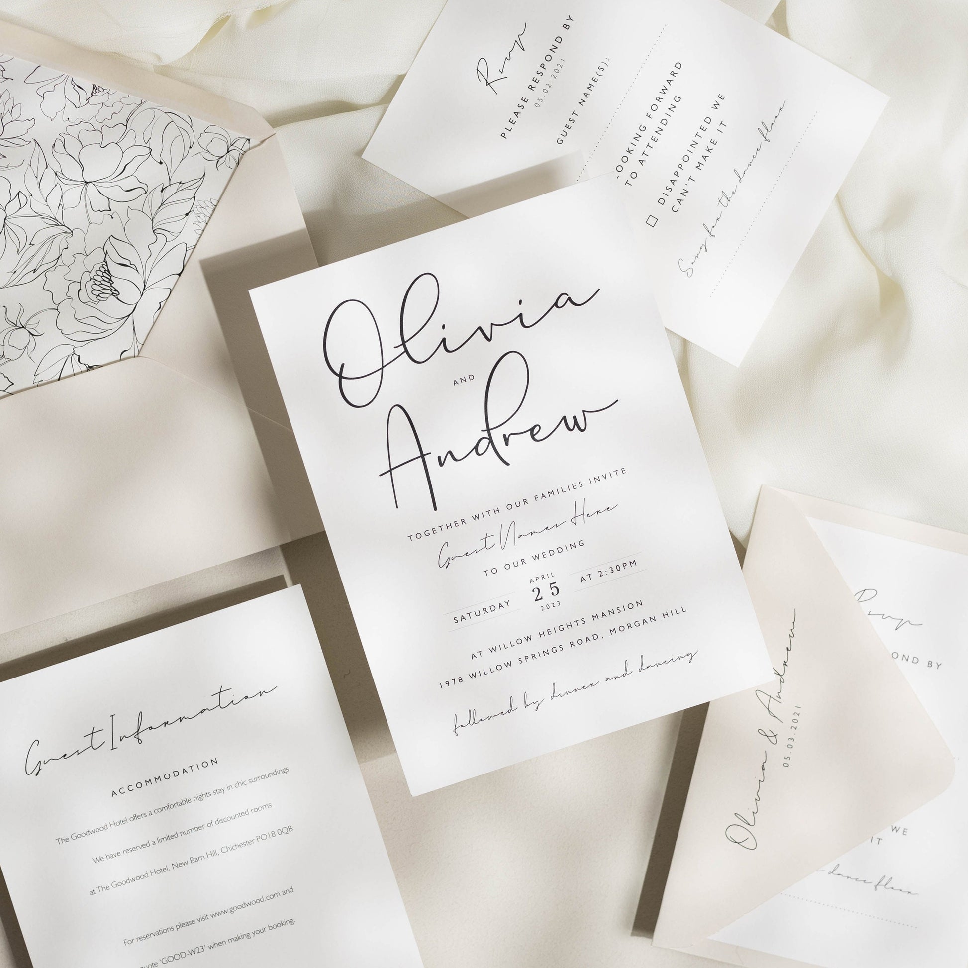 Ready to make a statement? Let's create your dream wedding invite! Our unique quote link for this design is quote.link/olivia-postcard, all you need to do is pop it into your URL and it will offer you all the options to add to make it personal.