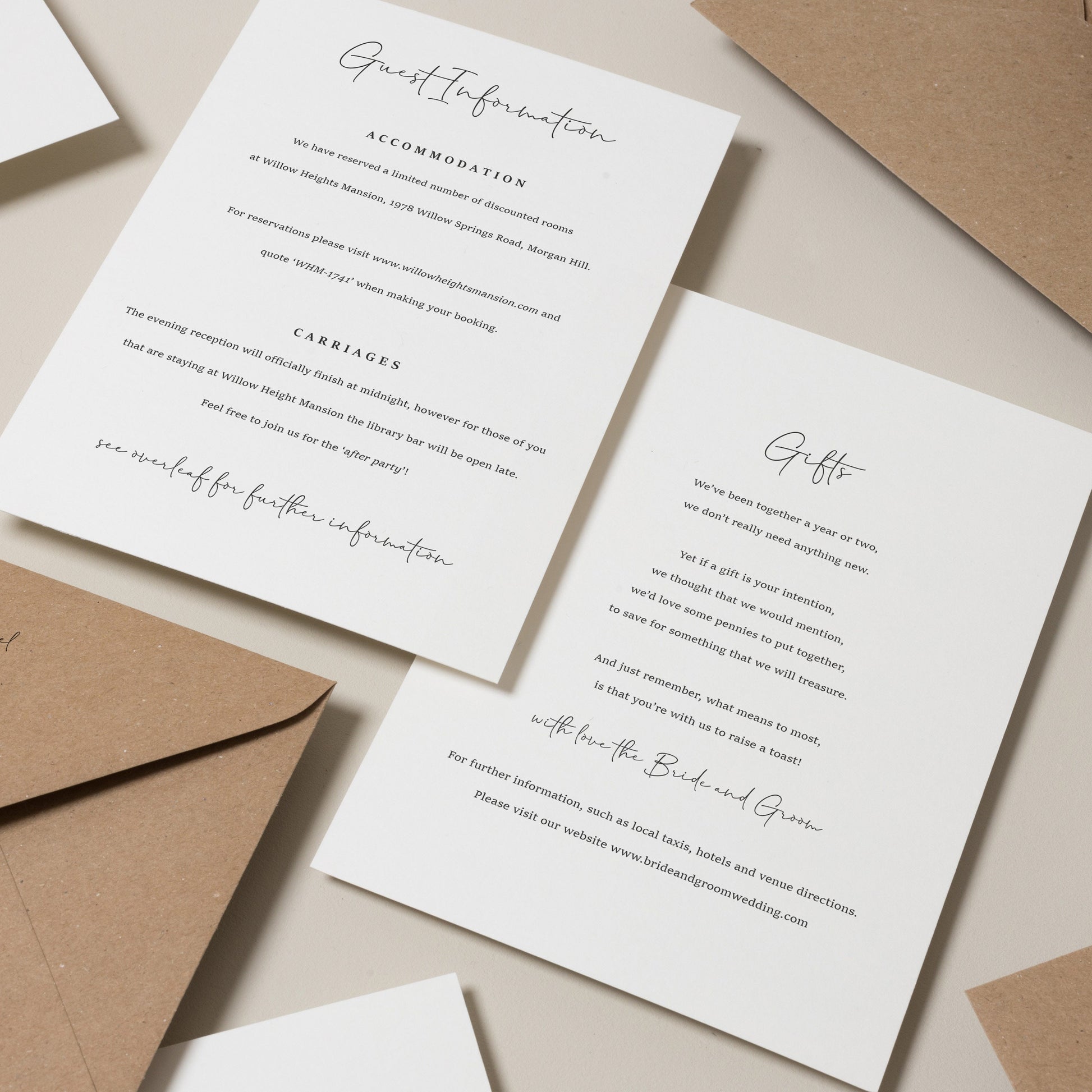 INFO CARDS: Useful for additional info such as taxi numbers, hotels, gift lists, poem's and more.