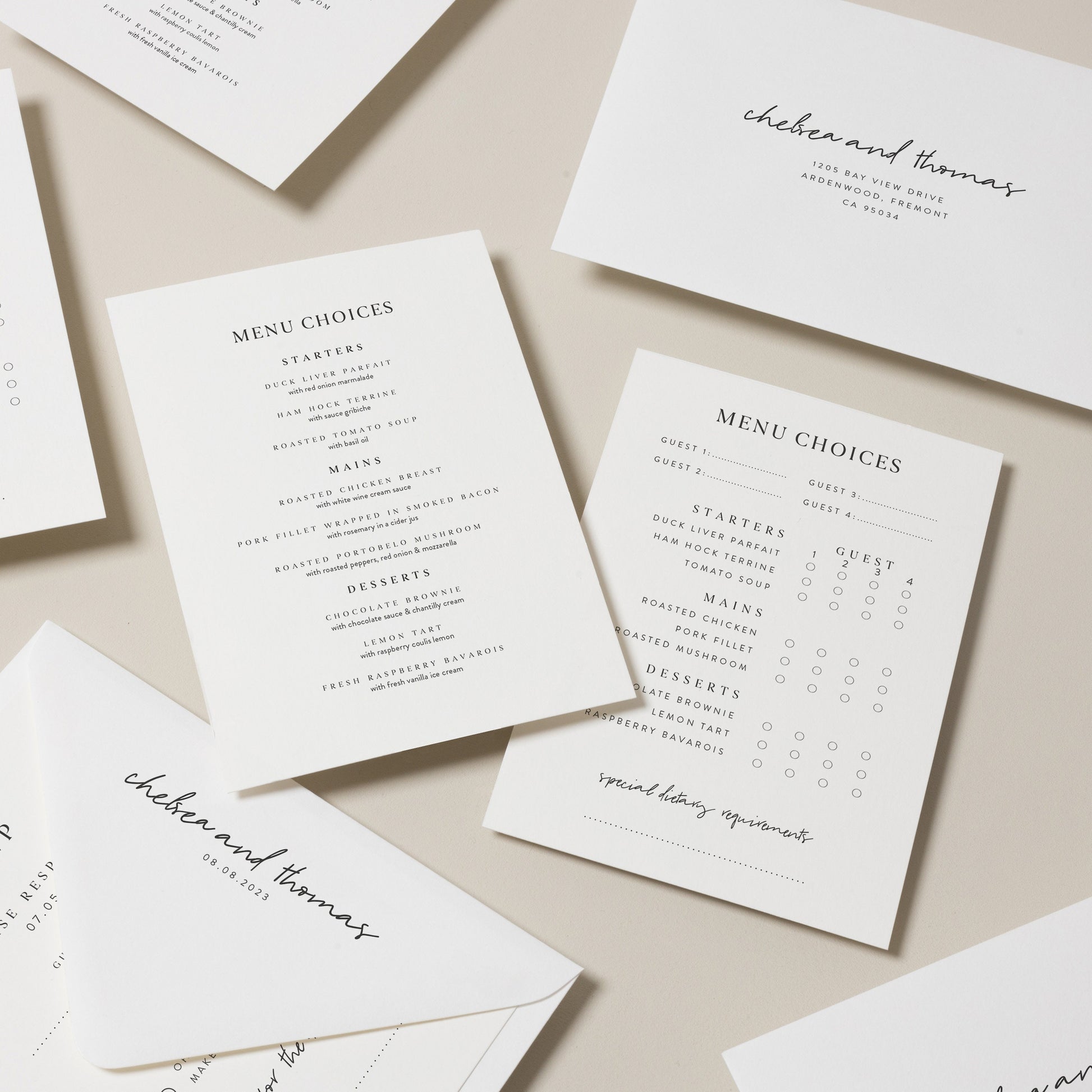RSVPS: Choose one sided for a simple yes/no response or both sides for menu choices.