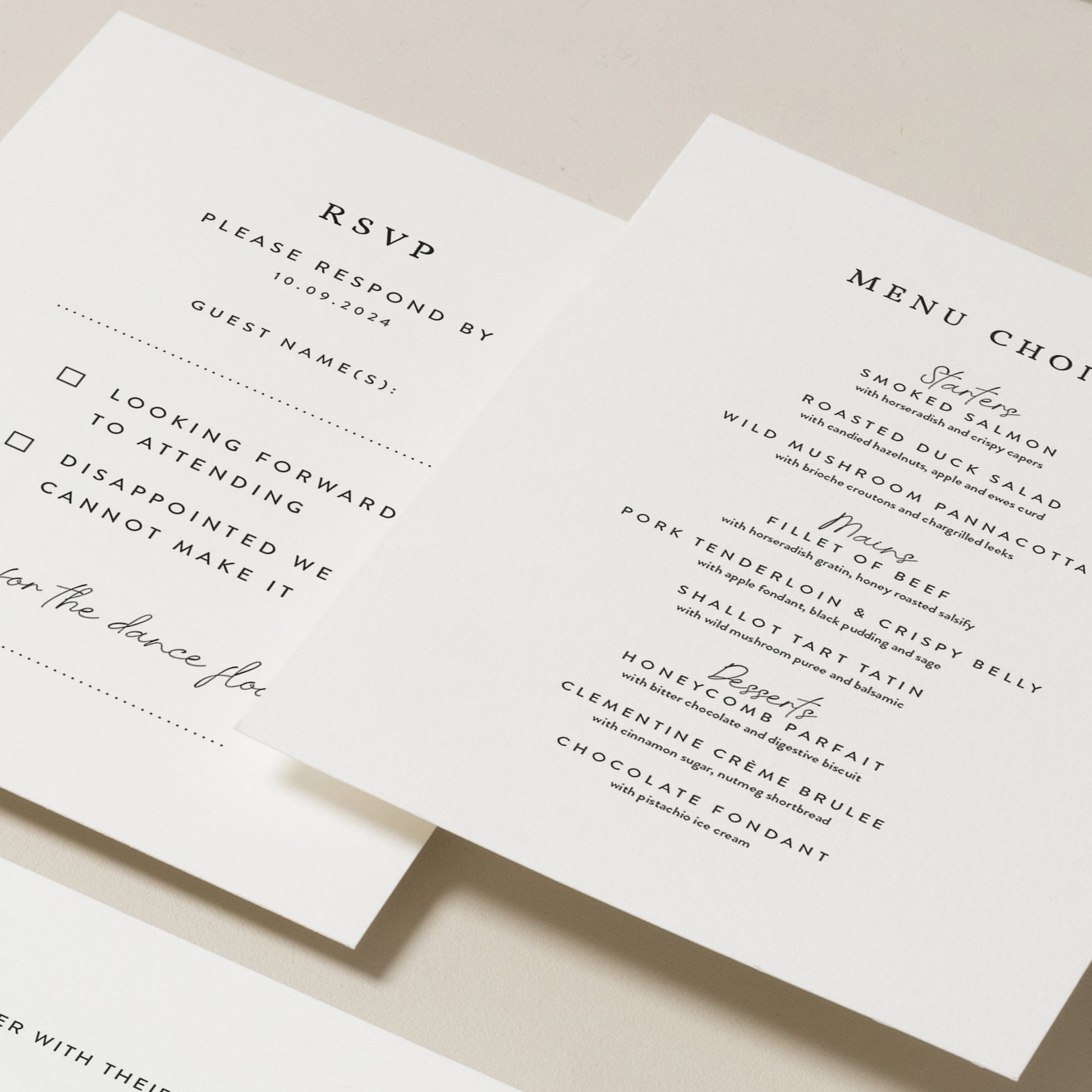 RSVPS: Choose one sided for a simple yes/no response or both sides for menu choices.