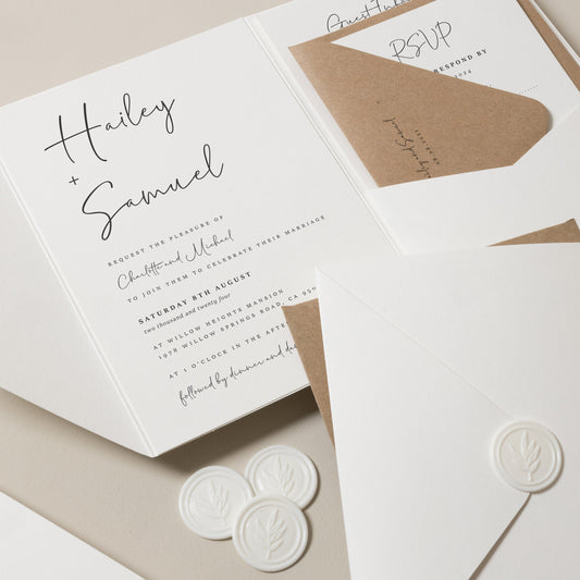 Ready to make a statement? Let's create your dream wedding invite! Our unique quote link for this design is quote.link/chelsea-pocketfold, all you need to do is pop it into your URL and it will offer you all the options to add to make it personal.