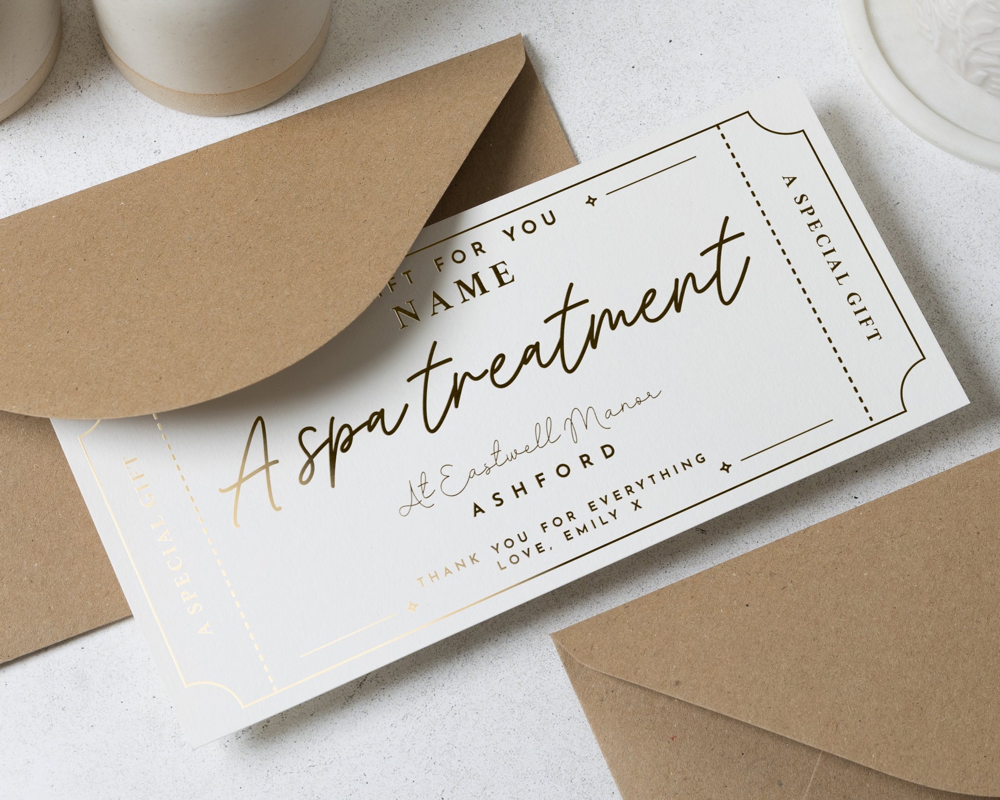 Treat someone special to a luxurious spa day with this personalised gold foil gift voucher. Customise with recipient name, gift, venue, location, and your own message.