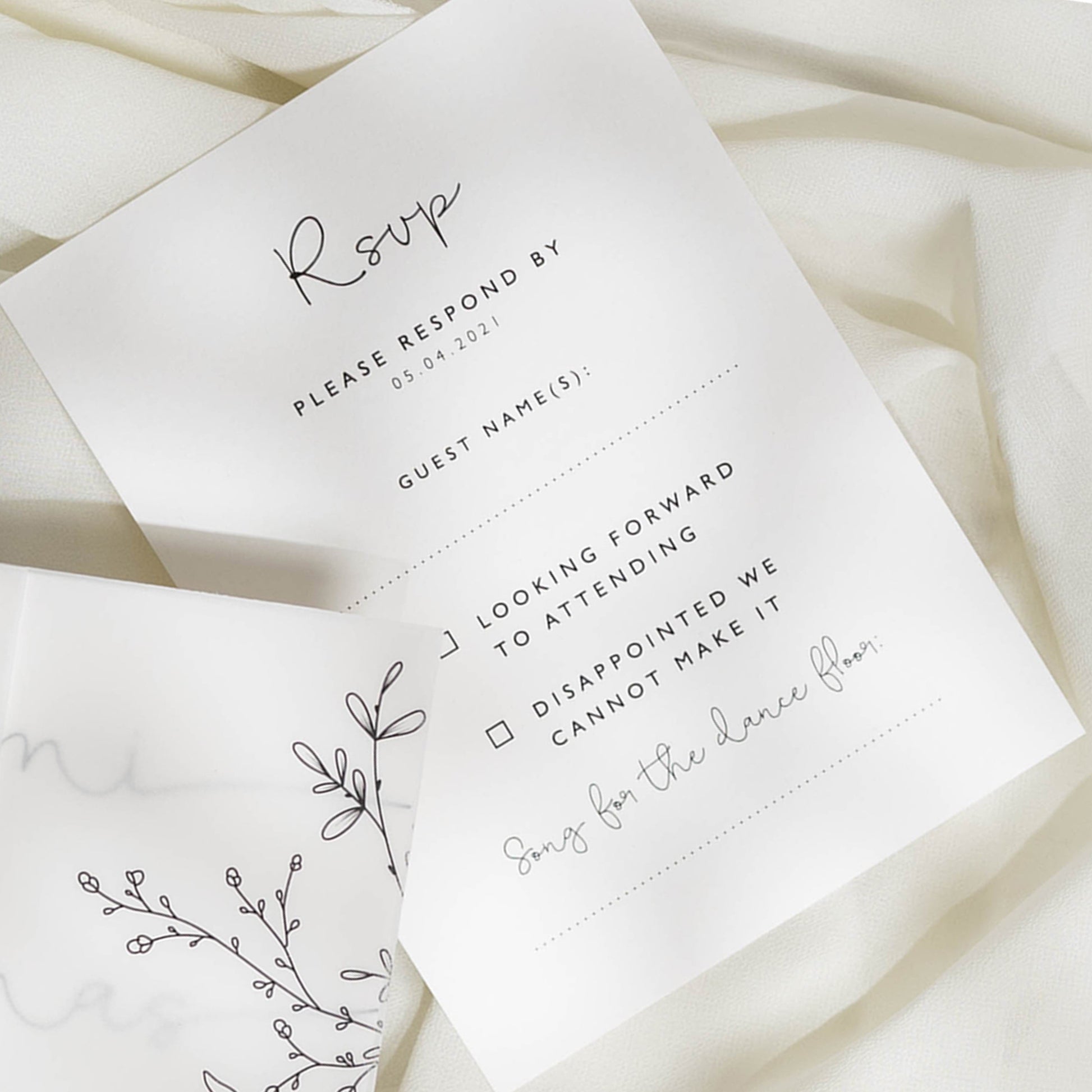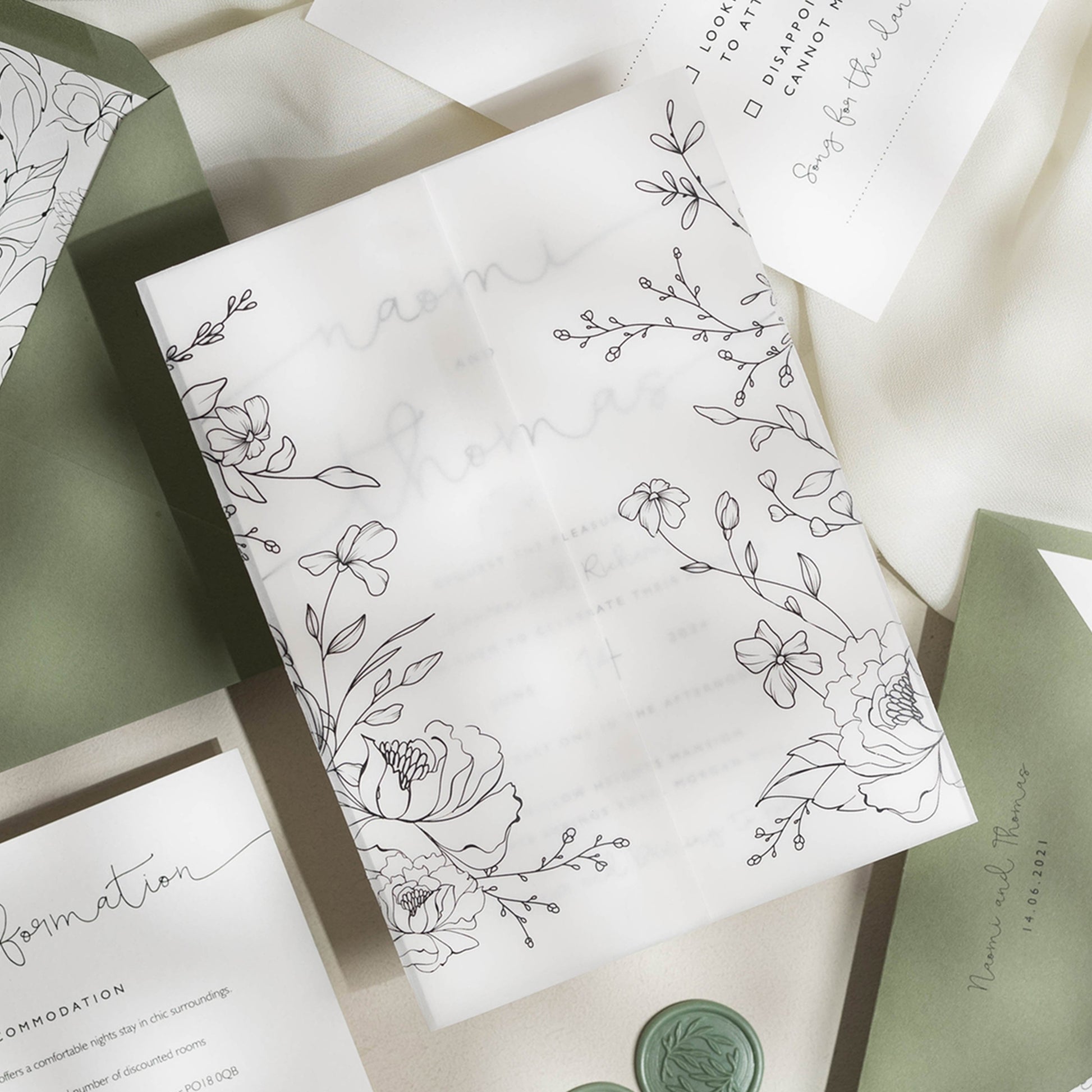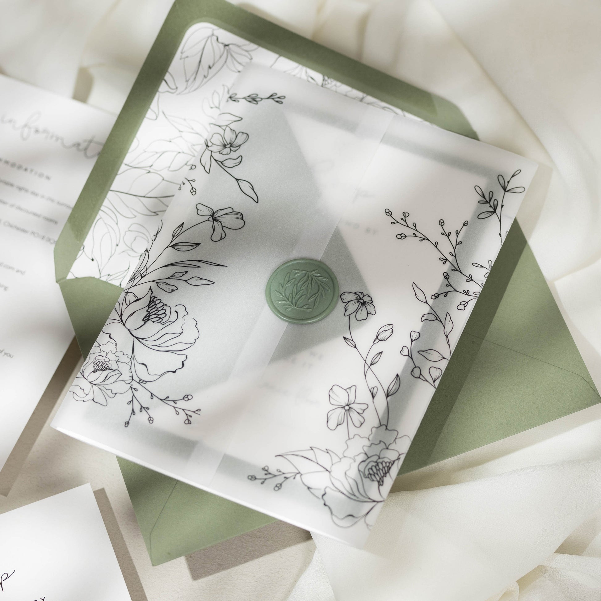 VELLUM JACKETS: Our translucent vellum jackets wrap around your invitations to add interest, texture and intrigue.
