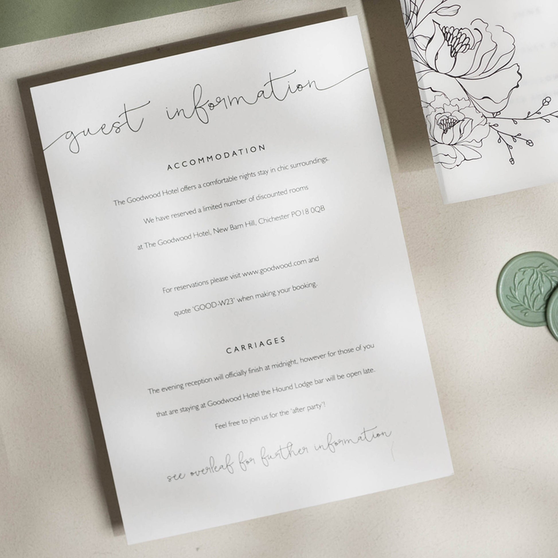INFO CARDS: Useful for additional info such as taxi numbers, hotels, gift lists, poem's and more.