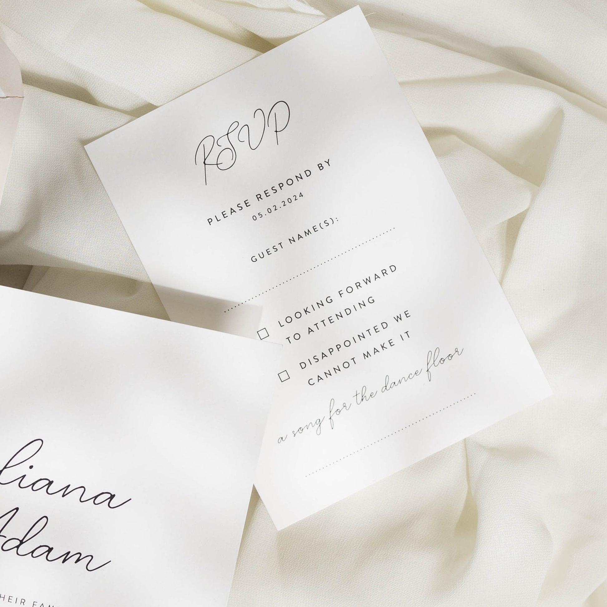 RSVPS: Choose one sided for a simple yes/no response or both sides for menu choices.