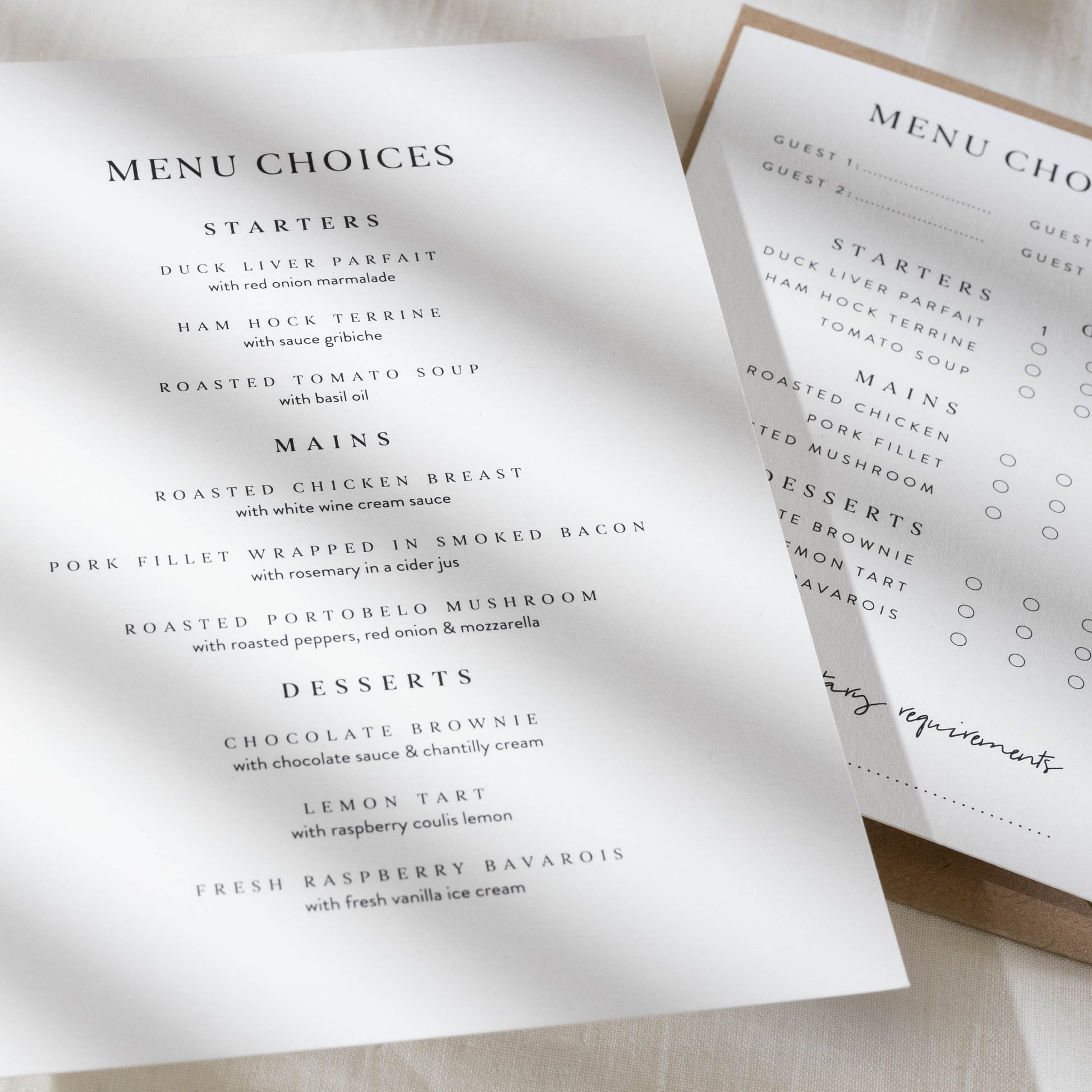 RSVPS: Choose one sided for a simple yes/no response or both sides for menu choices.