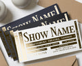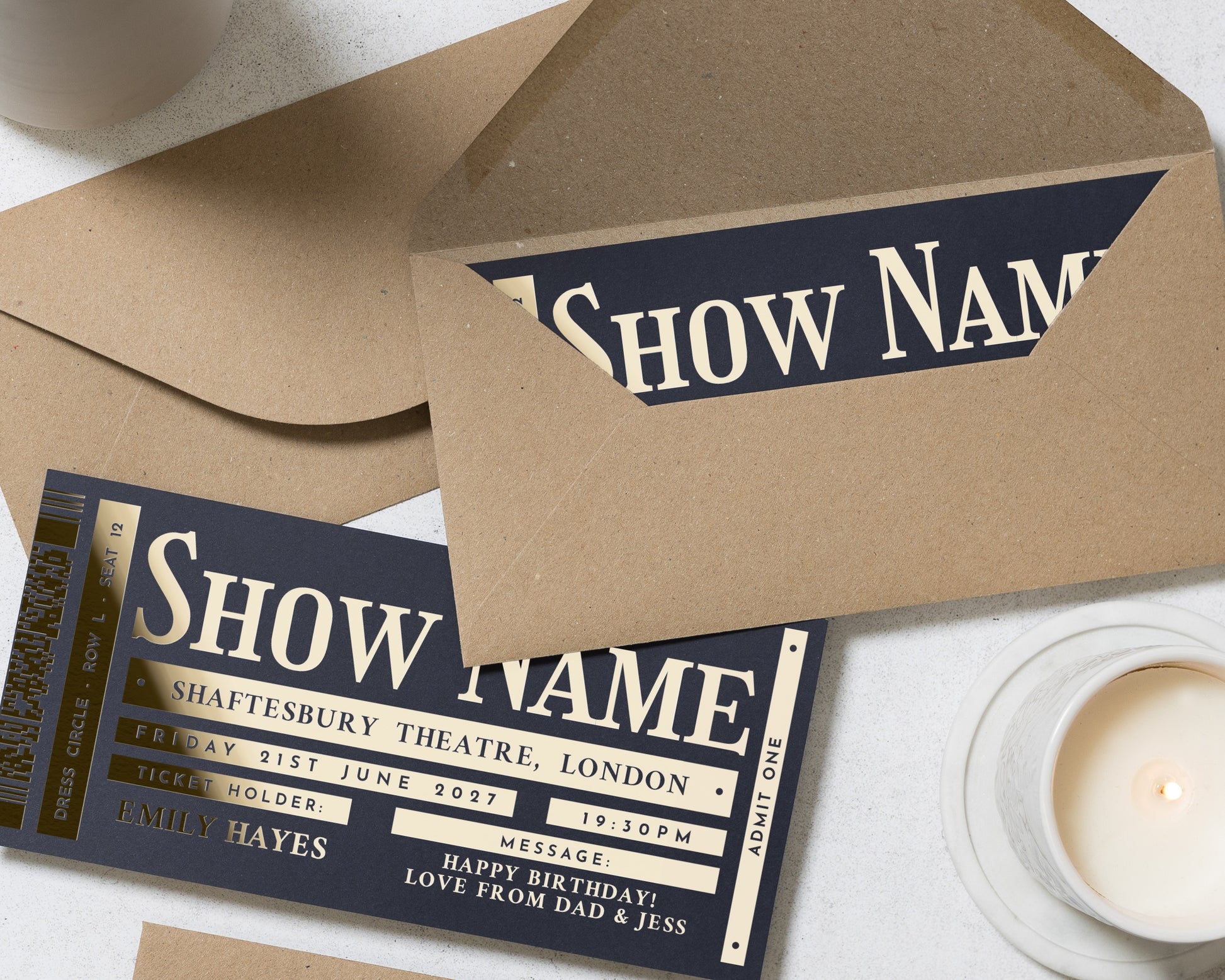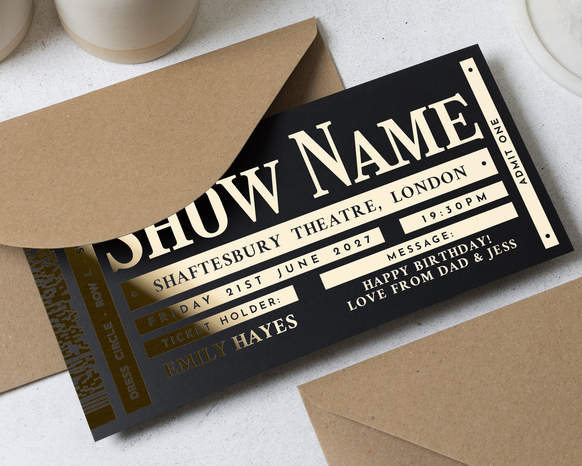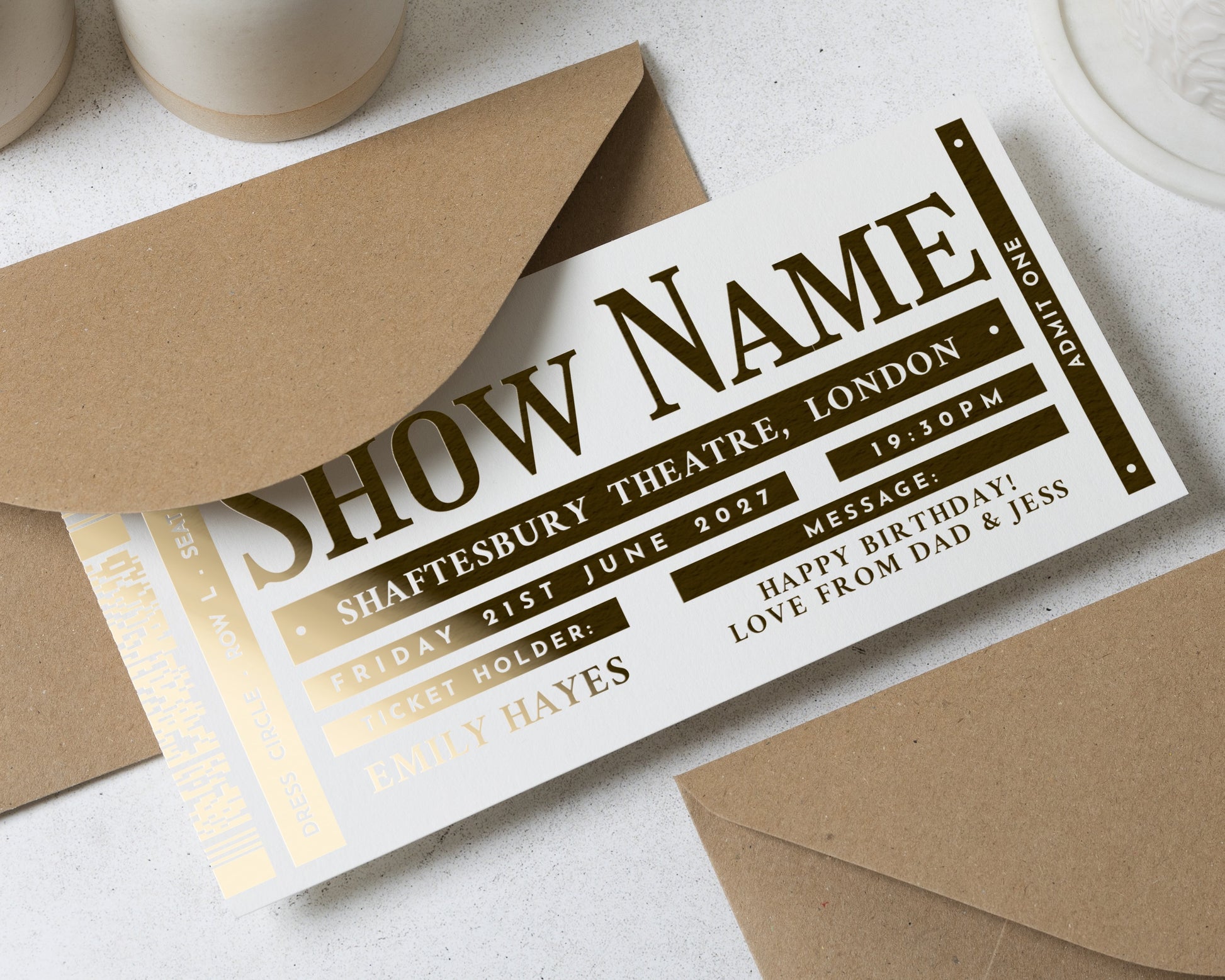 A luxurious gold foil personalised theatre ticket gift voucher, perfect for birthdays and special occasions. Customise with show details and a message.